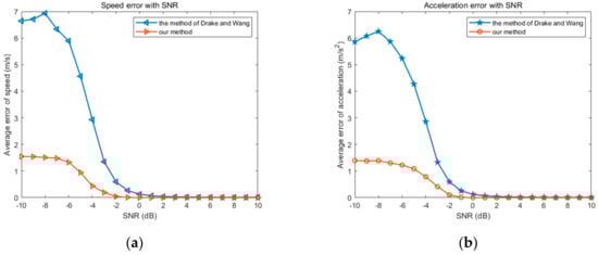 The motion parameters estimation errors of two methods. (a) shows the different speed error with SNR in our method and Drake’s; (b) shows the different acceleration error with SNR in our method and Drake’s.