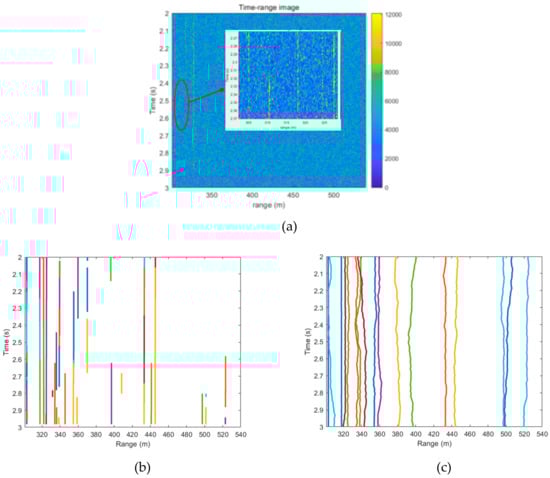 As an example, a piece of typical detection result is showed in Figure 9. Figure 9a the time-range image corresponding to the detection result, where the SNR of the target is low. In Figure 9b, the detection results by MTD are shown, and the detection results by DP-FrFT are shown in Figure 9c.