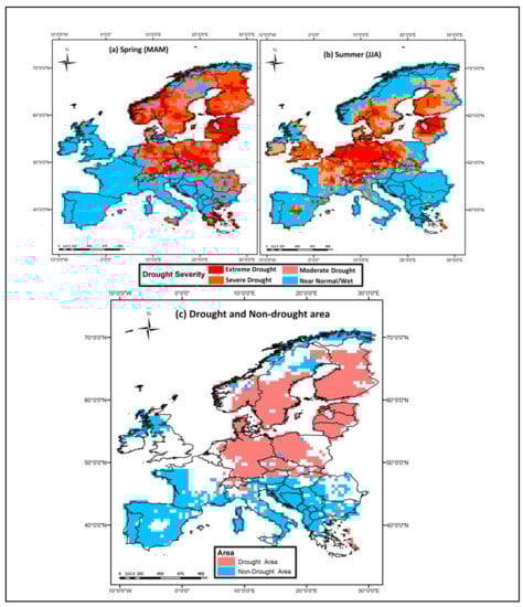 The gridded SPEI data for spring (March, April, and May (MAM); SPEI-3 for May month) and summer (June, July, and August (JJA); SPEI-3 for August month) were obtained from the SPEI Global Drought Monitor (http://spei.csic.es/index.html). The drought areas were defined as the areas which showed SPEI less than or equal to −1 (meteorological drought conditions) for both spring and summer season [,] of 2018, whereas the non-drought areas were the ones with SPEI greater than −1 (near normal and wet conditions, or non-drought conditions) for both spring and summer of 2018.