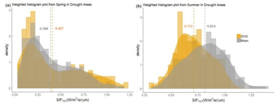 Overall solar-induced (chlorophyll) fluorescence (SIF) variation in (a) spring and (b) summer season for drought areas in 2018 (SIF_2018, in orange) compared to mean SIF values from 2015–2017 (SIF_Mean, in grey). Bars indicate the histogram of the SIF, whereas curves represent the density plot of the histogram.