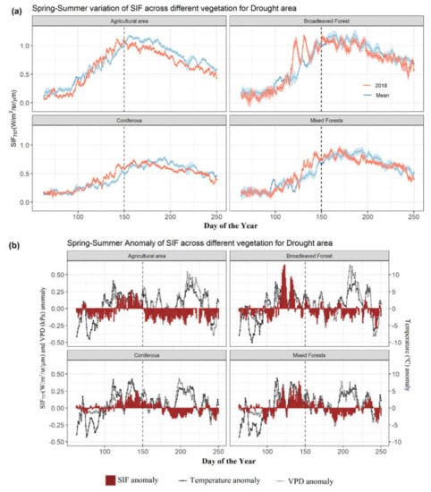 The drought area was characterized by higher temperatures during the second half of both spring and summer season (Figure 3b). For the drought area, SIF-Diff was initially significantly negative at the start of the spring season for the agricultural area, whereas the difference was not significant for forests. Here, significance is considered as a departure of (SIF/fPAR/NDVI) values >1 standard error [,], e.g., for Figure 3a, when the blue and red shades are not overlapping. However, with increase in Temp-Diff and VPD-Diff from a couple of weeks after the middle of spring season (Day of the year (DOY) - 120), SIF-Diff significantly increased across all land cover types (Figure 3a,b), with SIF-Diff values as high as 0.25, 0.65, 0.25, and 0.4 W/m2/sr/µm for agricultural area, broadleaved, coniferous, and mixed forests, respectively. The broadleaved forests (BLF) in the drought area occur across a large range of latitude (from 45 N in Germany to 70 N in Norway; Figure S2) and Köppen climate zones (warm summer and cool summer). More intense and early spring warming occurred in the warm summer climate, whereas a moderate and later warming occurred in the cool summer climate zone (blue and black line in Figure S7). This seems to have caused leaf flushing (represented by the blue and green box in Figure S7) at a difference of about 20 days between the two climate zones. Now, since our result is spatially and temporally aggregated, this shows two peaks during the spring for BLF. Thus, although there was no overall change in SIF for the spring season (Section 3.1), we observed a change in the intra-spring SIF variation pattern in 2018 compared to the mean, with an initial decrease (March to April) followed by a significant increase in SIF in May. This intra-spring SIF variation was reflected in the fPAR variations during the spring season for the drought area (Figure S4a). Thus, SIF variation in spring was strongly related to fPAR for drought areas where continuously higher temperature and VPD were observed in the second half of the spring season (April–May). The summer season of 2018 was characterized by negative SIF-Diff (Figure 3), especially for agricultural areas which showed continuously negative values throughout the summer season (Figure 3). For forest areas, however, we observed significantly negative SIF-Diff only in the later part of summer (from July, DOY 185–215) when the temperature values were more than 5 degrees higher than the mean (Figure 3b).