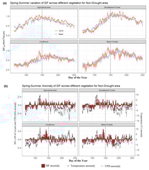 Our study showed a clear impact of the European hotter drought of 2018 on overall and intra-seasonal SIF variation for different vegetation types as captured by the OCO-2 SIF. Early spring of 2018 was characterized by lower than average temperatures and VPD (i.e., non-stressed stage) followed by above-average temperatures and VPD in the later part of spring (April–May; Figure 3b). Such cooler and wetter conditions in early spring can result in poor crop development and lower productivity [] and thus lower SIF values ([]; Figure 3b). Moreover, the initially cooler conditions in spring might have delayed the leaf flushing in deciduous trees, resulting in lower SIF values of broadleaved forests (Figure 3b). This pattern was less evident for the coniferous and mixed forests, probably due to the presence of evergreen trees. In addition, the wet conditions during early spring most likely built up enough soil moisture for the later spring season, thus moderating the sudden warming in later spring season [,]. This combination of ample moisture supply with a rise in temperature resulted in an increase in SIF to above-average values across all vegetation types (Figure 3 and Figure 6). The variation in SIF depends on the variation of both APAR (and fPAR) and SIFyield (Equation (1), []). Both SIF and fPAR were increasing during the spring season for both drought and non-drought areas (Figure 3 and Figure 4, Figures S4a and S5a). Moreover, for agriculture areas affected by drought, the peaks of fPAR and SIF were on almost the same day of the year (DOY ~ 145; Figure 3a and Figure S4a). However, this clear synchronicity was not found for forests. Nevertheless, we conclude that the satellite-based SIF variation was closely coupled with fPAR variation under non-stress conditions (spring for drought areas and for non-drought areas in spring and summer). Previous studies [,,] have also highlighted the synchronicity of satellite-based SIF with fPAR.