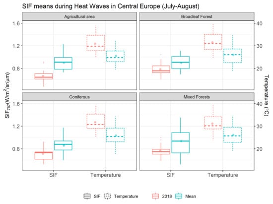 The intense heatwave in Central Europe during July and August resulted in a significant decrease in SIF across all the four vegetation types, which was particularly pronounced for agricultural areas. The heatwave occurred at the end of the already dry summer, which was preceded by a dry spring. As a consequence of persisting drought, many crops desiccated, thus not emitting any fluorescence by the end of July when temperatures were extremely high in Central Europe. Water stress due to high-temperature anomalies during a drought event can further increase heat stress due to an extended period of stomatal closure and subsequent reduction in evaporative cooling [], thus causing positive feedback resulting in even warmer conditions [].