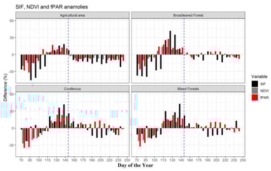 The non-drought areas were characterized by significantly higher temperatures only during the end of April (DOY 105–120) as illustrated in Figure 4b. Here, we observed the spring variation to be similar to that of the drought area (Figure 4a,b), which is also visible in the fPAR data (Figure S4a). In contrast to the drought area, summer in the non-drought area featured positive SIF-Diff for all the vegetation types and especially for the agricultural area. For the non-drought area, fPAR in summer was higher than the mean value (Figure S5a) and also seems to closely relate to the SIF variation.