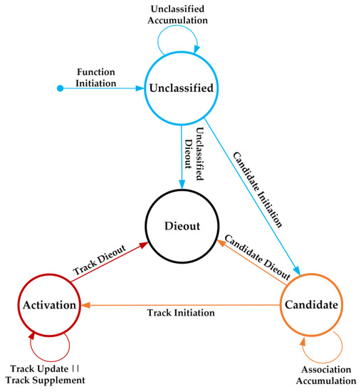 Conventional data association methods, such as nearest neighbor data association (NNDA), probabilistic data association (PDA), and joint PDA (JPDA) algorithms, commonly rely on the spatial distance relationship of the target, but without using prior information on the target, which leads to noise data being treated as the real target. Considering that a target vehicle as an inertial system is unlikely to appear or disappear instantly, the number of times the target is associated can be taken as prior information, and historical data can be ranked, with priority given to the data that were continuously observed for the highest number of times and the latest data, which allows the tracking process to be described by a finite state machine for each target tracked, as shown in Figure 1. All targets in different stages of tracking are categorized into four types, namely Unclassified, Candidate, Activation, and Dieout. The transfer process of target type is as following: the process from the Unclassified target to the Candidate target corresponds to the candidate initial stage, the process from the Candidate target to the activation target corresponds to the track initiation stage, and the process from other types of targets to the Dieout target corresponds to the dieout stage.
