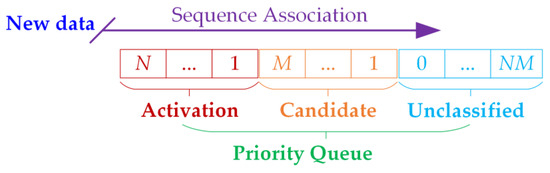 Furthermore, targets of different types are combined into a priority queue according to prior information on the number of times of association, as shown in Figure 2. At the beginning of each tracking cycle, the order of precedence associated with the new observed data is set as: Activation targets, Candidate targets, and Unclassified targets. Similarly, for the targets of the same type, the priority associated with the new data is also ranked by the number of successful associations. In each tracking cycle, each type of target accumulates the number of successful association counts, which means the count is increased by 1 if the association is successful, and otherwise the count is reduced by 1. Additionally, targets of different types rely on different sliding time windows; for example, the maximum sliding time window of an Unclassified target is NM, which means that the Unclassified target will disappear when the cumulative number of unassociated times reaches NM + 1 and the Unclassified target type is converted into a Candidate target once the target association is successful, with the count being 1. If the Candidate target is successfully correlated for M consecutive times, the target state is shifted to the Activation state and the count is 1. If the Candidate target is not associated for M times in a row, however, the candidate target will disappear.