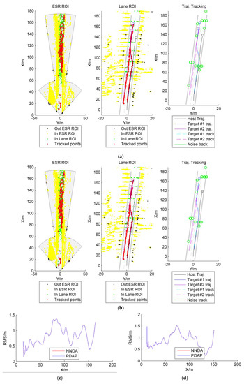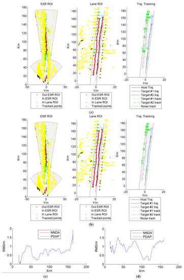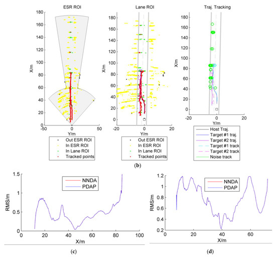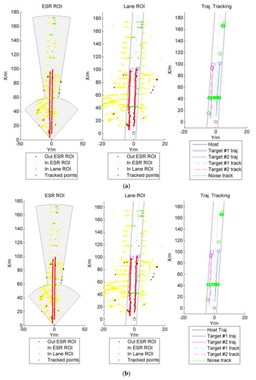 In order to verify the performance of the proposed algorithm, the nearest neighbor data association (NNDA) was adopted as a comparison algorithm; it is the most widely used and suboptimal Bayesian algorithm [24]. As both algorithms rely on a coordinate turn process model and an unscented Kalman filter, the proposed method is denoted as priority data association policy for coordinate turn process model with unscented Kalman filter (PDAP-CT-UKF) and the compared algorithm is denoted by nearest neighbor data association for coordinate turn process model with unscented Kalman filter (NNDA-CT-UKF). The root-mean-square error (RMS) and the mean value of RMS (MRMS) are taken as the index used to assess the performance in tracking real targets, while the total tracked targets are taken as the index used to evaluate the performance in filtering fake targets. As shown in Figure 5, Figure 6, Figure 7 and Figure 8, the region-of-interest (ROI), both ESR ROI and Lane ROI, is used to filter out targets, which beyond the ROI. Both PDAP-CT-UKF and NNDA-CT-UKF performed well in tracking multiple targets and had the same RMS, which means the proposed method (PDAP) and the NNDA are suboptimal in the four typical scenarios in real-time. The tracking data are listed in Table 1. According to the MRMS results, both the PDAP and NNDA showed suboptimal results. Compared with NNDA, however, the total number of targets tracked by PDAP was smaller, which means the proposed algorithm has the capability to filter noise. However, both for NNDA and PDAP, the total number of tracked targets was significantly greater than the number of real targets, which means there should be only two real targets, target #1 and target #2. This suggests that there remains room for the algorithm to be improved significantly.