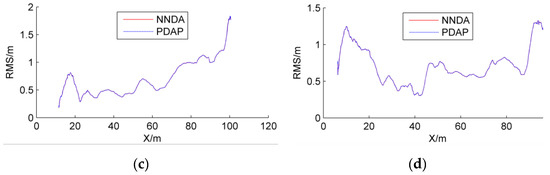 Real test for scenario 3. (a) NNDA-CT-UKF multitarget tracking; (b) PDAP-CT-UKF multitarget tracking; (c) RMS for tracking target #1; (d) RMS for tracking target #2.