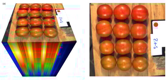 Hyperspectral images of tomatoes were instantly taken by a portable hyperspectral camera, Specim IQ (Spectral Imaging Ltd., Oulu Finland; [40]), with a spatial resolution of 512 × 512 pixels, a spectral resolution of 7 nm, and 204 spectral bands from 397 to 1003 nm. Calibration was conducted following the user manual. When taking images, the camera was placed 100 cm above the table where 12 tomatoes were placed on a tripod. Two Arrilite 750 Plus halogen lamps (ARRI, Munich, Germany) were symmetrically placed beside the camera for illumination. A white panel (90% reflectance) was placed adjacent to the tomatoes as a reference target for reflectance transformation [40].