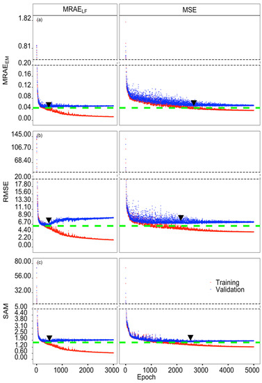 The training and validation histories of the three evaluation metrics MRAEEM, RMSE, and SAM are displayed in Figure 2. MRAEEM, RMSE, and SAM of models with MRAELF loss function (Figure 2, left subpanels) decreased sharply at the beginning and reached minimum values of 0.0453, 6.223, and 1.676 at the 472nd, 476th, and 500th epoch, respectively. For all three evaluation metrics, values increased slightly with subsequent epochs and finally stabilized after approx. 1000 epochs. The minimum values of MRAEEM, RMSE, and SAM from models with MSE loss function (Figure 2, right subpanels) also decreased, possessing higher fluctuations, and showed higher minimum values of 0.0507, 6.778, and 1.735 at the 2663th, 2156th, and 2531st epoch, respectively (Figure 2, Table 1). Both the number of epochs and time consumed for reaching the minimum values of three criteria during validation were much less in models with the MRAELF loss function, i.e., less than 500 epochs and 90 seconds, compared with MSE ones.