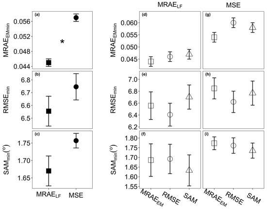 Selection of models with a lower loss when training with the HSCNN-R model using different loss functions and evaluated with different evaluation metrics. Comparison of minimum values of MRAEEM (MRAEEMmin), RMSE (RMSEmin), and SAM (SAMmin) based on three evaluation metrics, and MRAEEM, RMSE, and SAM, from models trained with either MRAELF or MSE loss function during permutation test. (a–c) Comparisons between two loss functions, mean values with standard error, n = 15, * indicates a significant difference with p < 0.05; (d–f) comparisons within the loss functions MRAELF (d–f) and MSE (g–i), mean values with standard error, n = 5.