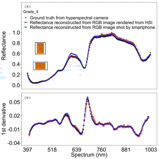 To further confirm the robustness of the selected model in reconstructing hyperspectral images, reconstructed spectral reflectance of RGB images either rendered from hyperspectral images or directly captured by smartphone camera, were compared with directly measured spectral reflectance from the hyperspectral camera (“ground truth”). The similarity of both the reflectance and corresponding 1st derivative demonstrated that the selected approach resulted in a reliable reconstruction of the spectral pattern. As the RGB image used for training was rendered from hyperspectral images by a standard CIE matching function while smartphone RGB sensors have different spectral sensitivity functions likely deviating from CIE [22], an increase of errors during the reconstruction of hyperspectral images from RGB smartphone sensors might be expected. However, although the RGB images from the smartphone were completely new to the trained model, the reconstruction results demonstrated the soundness of the model in recovering the spectral reflectance even from regular RGB images taken by a standard smartphone model.