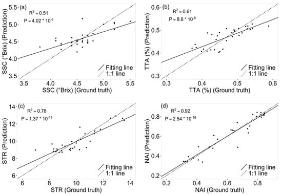 Tomato quality properties’ soluble solid content (SSC), total titratable acidity (TTA), and their ratio (STR) were predicted with good agreement to the corresponding laboratory measurements (Figure 5a–c), featuring R2 of 0.51, 0.61, and 0.78, respectively. Lycopene content, as indicated by NAI, was predicted with a high accuracy of R2 = 0.92 (Figure 5d). All four quality parameters were predicted significantly better than random guessing, denoted by corresponding p values of 4.02 × 10−6, 8.8 × 10−8, 1.37 × 10−11, and 2.54 × 10−18 in F test. The relationship between SSC, TTA, STR, and the NAI was found to be close to zero (Figure S2).