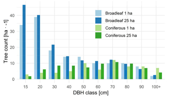 Our analysis is based on supervised segmentation of high-density point clouds from TLS and drone lidar collected within two days of each other under leaf-off conditions (16–18 April 2018) in a temperate mountain forest in the south Bohemia region of the Czech Republic (48°40′N 14°42′E; [18]). The site contains the 25 ha Žofín Forest Dynamics Plot (ZFDP). The ZFDP lies within the strictly protected (since 1838) forest national nature reserve and represents dense, structurally complex and variable old-growth forest dominated by European beech (Fagus sylvatica), with Norway spruce (Picea abies) and individuals of silver fir (Abies alba), and several other rare species [19]. At the ZFDP all free-standing woody plants with DBH > 1 cm have been mapped (X, Y, and Z coordinates of stem bases), measured (DBH) and identified to the species level using the ForestGEO protocol [19,20,21] in 2017 (see also Figure A2). The mean live stem density is >3000 individuals · ha−1. TLS data were collected from 22 scanning positions within a 1 ha subplot in the ZFDP using a Lecia P20 ScanStation. The species composition and size distribution within the 1 ha subplot closely matched the composition of the 25 ha ZFDP (Figure 1). These data were co-registered using reflective targets, georeferenced and thinned using a 5 mm voxel grid. Mean absolute error on the target for the co-registration of single scans was 1 mm. Georeferencing of the TLS and field data is based on a permanent network of reference points with geodetically measured coordinates (total station). Ground and vegetation points in TLS data were classified in 3D Forest using the terrain-from-octree algorithm [15]. A further detailed description of TLS processing is in [15].