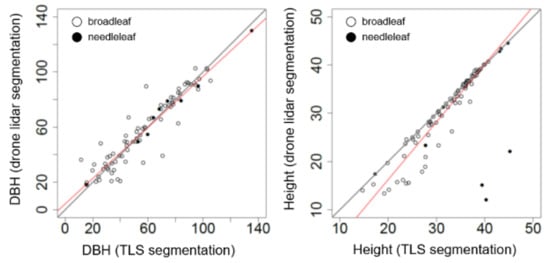 There is a linear relationship between the estimated DBH from segmentations applied to drone lidar and TLS data for the same individual trees (Figure 5). The intercept and slope of this relationship are 4.26 (p = 0.575) and 0.93 ((p < 0.001) respectively (r2 = 0.981, RSE = 8.91 cm, n = 85). Dummy-variables regression indicates that the slope and intercept are not statistically different between needleleaf and broadleaf trees ((p = 0.966 for the change in intercept, and (p = 0.969 for the change in slope). Our results are similar to those reported by [7] for 39 manually segmented trees in a temperate broadleaf forest in northeastern Europe, where the RSE was 4.24 cm and there was a 1.71 cm positive bias in comparison to TLS. Our analysis indicates that supervised segmentation of high-density measurements from low-altitude drone flight can produce estimates of individual tree diameter that are statistically indistinguishable from those acquired using TLS.