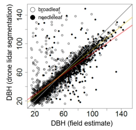The DBH relationship for trees segmented using high-density drone lidar and field estimates. Grey line is the 1:1 relationship. Red line is the needleleaf-tree regression. Orange line is the broadleaf-tree regression.