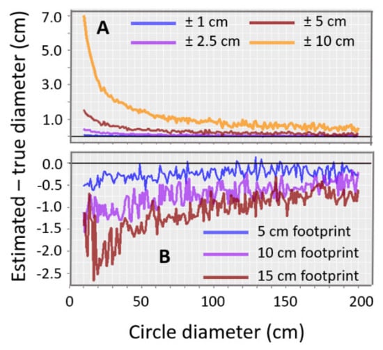 For larger trees the DBH estimate is biased in the opposite direction. Needleleaf trees >52.9 cm DBH, and broadleaf trees >55.3 cm DBH experience an underestimation error in comparison to field measurements. The predicted underestimation error for a 100 cm DBH needleleaf tree is 13.2 cm. The corresponding broadleaf individual has an underestimation error of 8.2 cm. Our simulations indicate that in contrast to the positive bias in diameter estimates caused by random error in point locations, footprint size can cause an underestimation error of <1.5 cm for trees of this size when the footprint is close to 15 cm in diameter (Figure 7). The footprint-size bias approaches −1 cm as stem diameter increases. For the largest simulated footprints of 15 cm, the footprint-size bias is about 25% on a 10 cm diameter circle, and less than 4% for circles >40 cm in diameter (Figure 7). Thus, we cannot reject the possibility that variation in footprint size is contributing to underestimation error in DBH from drone-lidar segmentations of large trees, but it is clear that most of the underestimation error cannot be explained by variation in footprint size.