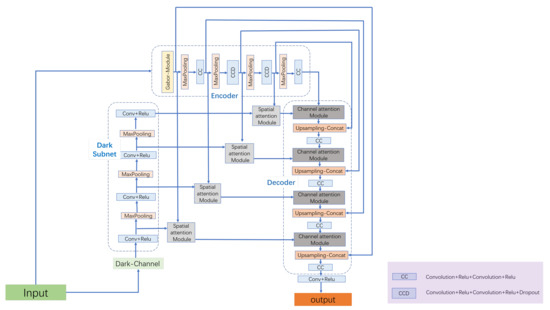 In the encoder–decoder structure, the encoder is primarily used for feature extraction and the decoder interprets the information to obtain the final result of the network recognition. The efficient interpretation capability of the decoder will greatly affect the final output of the network. Thus, inspired by the attention mechanism, we have introduced a spatial attention module that is based on Dark channel subnet and Channel attention module based on the higher-level features of the encoder to assist the decoder to enhance the key information, thereby improving the recognition ability of the decoder.