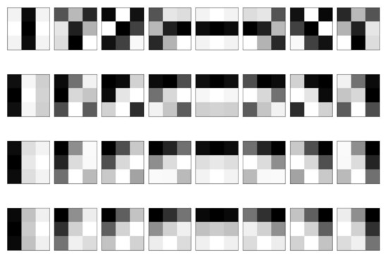 The real part predominantly extracts the texture features in the image, while the imaginary part predominantly extracts the edge information. Because the texture information extracted from the image is the main requirement, we only use the real part of this kernel function for filtering. In the function, determines the direction of the filter and, thus, the feature information in different directions can be extracted, depending on the different values taken by . The range of the values is and the interval is in order to obtain the texture features in multiple directions as uniformly as possible. The value of is usually greater than 2. Therefore, the range of values is , and the interval is 1. The size of the Gabor filters is . Deng et al. [32] and Chethan et al. [43] both used Gabor transform to extract texture features for cloud detection primarily, and improve the ability of the algorithm in order to distinguish between cloud regions and highlighted snow regions. They both use eight different orientations. We have also selected eight different orientations. We have selected four wavelengths in order to obtain more multi-scale information. In the parameter selection of the Gabor filter, a total of 32 features are obtained for each superpixel, using eight different orientations and four different wavelengths. The filters of the different wavelength or different directions have been shown, and the filters in each row have the same wavelength, while the filters in each column have the same direction, as shown in Figure 2. These parameters have been able to extract most of the texture features [47]. A finer range division will extract more detailed features, but this will also make the network structure more complex.