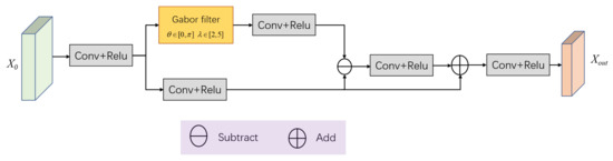 The information output from the Gabor transform in the upper branch passes through a convolutional layer with the activation function once again in order to increase the variety of the texture features. The difference between the features that were obtained from the upper and the lower branch is then extracted by carrying out a subtraction between the feature maps. After passing through a convolutional layer with the activation function, the difference information is added back to the output feature map of the lower branch. In fact, the upper branch information can produce a local supervision effect on the lower branch information and guide the lower branch to learn and pay more attention to the texture information. In Gabor feature extraction module, the sizes of the convolutional filters are all . The output feature maps of the convolutional layer have the same size as the input feature maps.