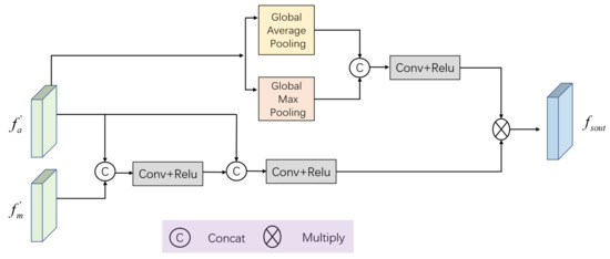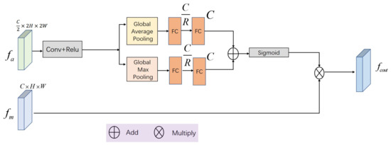where R denotes the ReLU function, D denotes the fully connected layer, and , and denote the average pooling and max pooling operations, respectively. In the upper branch, the number of channels of is adjusted to be the same as using a convolution layer with an activation function. Subsequently, two sets of vectors are obtained by performing a global maximum pooling and global average pooling of the channel dimension. After that, the resulting two sets of vectors obtained via two fully connected layers are then added, and finally the weight map is obtained using the Sigmoid function as: