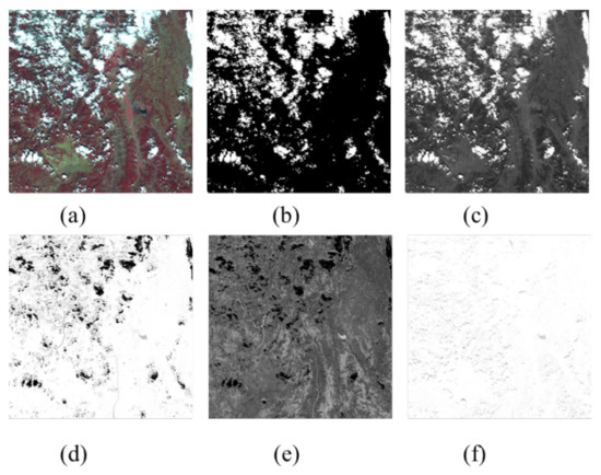 Spatial information screening is mainly related to color features. In a few rule-based cloud detection methods, a few color features are often extracted via operations between the different spectrum bands [15,51,52]. In the traditional cloud detection methods, it is generally preferred to convert the original image to a color space, in which the contrast between the cloud and non-cloud regions is more obvious. The color space transformation to the hue, saturation, and intensity (HSI) is always used in cloud detection [27,52,53]. However, we found that the Dark channel image is very similar to the cloud mask, as shown in Figure 6.