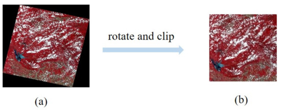 The approximate size of the images is . Out of the 108 scenes, 86 were selected as the training data. The rest were selected as the test data. We evaluated the distribution of clouds in the dataset, and different kinds of cloud covers are included. Balance training and test data as much as possible. All of the images were rotated and clipped to the size of in order to remove the surrounding black areas, as shown in Figure 7. This is because the black areas do not contain any remote sensing information, which is not helpful for feature extraction. At the same time, black areas are easy to be recognized by the network as a non-cloud area, which has a bad influence on the detection result. The training dataset was clipped to 41,624 small images by a stride of in each image. The test dataset was clipped to 10,648 small images by a stride of in each image. The value of the pixels in these patches was divided by 1023 in order to normalize between 0 and 1.