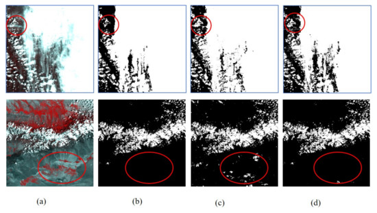 The subjective results of U- Net and NG have been compared, as shown in Figure 8. The remote sensing image in the first row contains the snow-covered area, which has been marked by the red circles. Generally, a cloud-covered area has high brightness, and, in the figure, the snow-covered area also has high brightness. Thus, the two types of areas are hard to distinguish by the naked eye. However, the snow-covered area is relatively rougher than the cloud-covered area due to its rich texture feature.