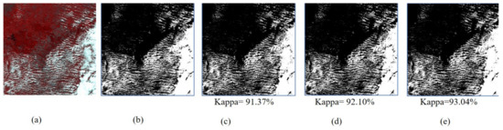 (a) NIR-R-G image, (b) ground truth, and masks generated by (c) U-Net, (d) NC, and (e) NDSC.