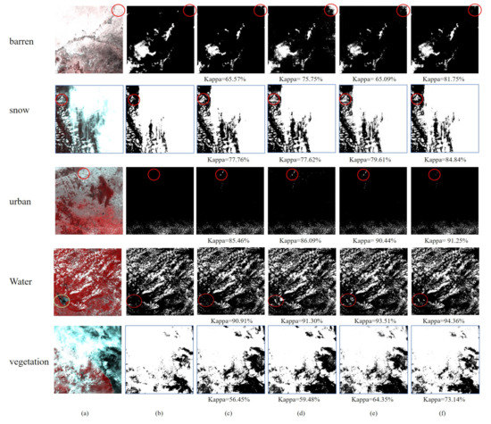 In the first row, there is no object covering the ground, and some ground areas have high reflectivity similar to the cloud area. In the area that is marked by the red circle, the false alarm detections by the DeepLabv3+ and RS-Net are observed to be significantly higher than NGAD. Although these areas have high brightness, they have more texture information than the cloud areas in the figure. There are no false alarm detections in this area from the SegNet, while many cloud areas are missed from the overall view of the image. Therefore, it can be seen from the Kappa coefficient that the cloud detection ability of SegNet is poor. Similarly, results that correspond to RS-Net show obvious false alarm detections as well as obviously missed cloud detections. Thus, its overall detection ability is worse than SegNet. The results corresponding to NGAD show relatively few false alarm detections and missed detections in the cloud area and, thus, its overall detection ability is better than the other three models.