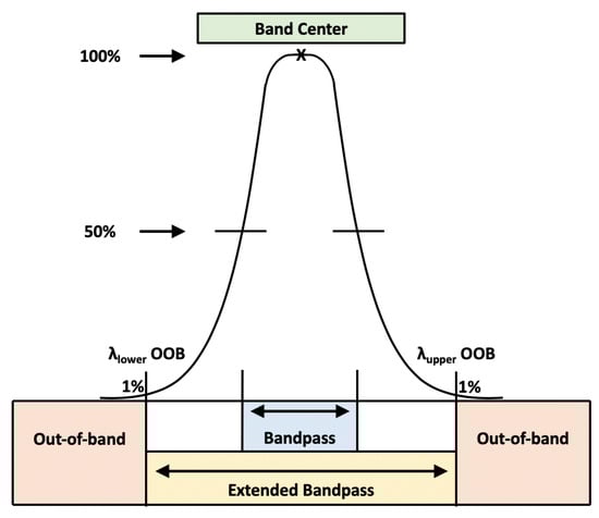 Schematic of “VIIRS spectral performance specification metrics,” which is a recreation of “Figure 1” from the works of Moeller et al. and Schwarting et al. [,,,,,]. The lower and upper wavelength 1% response limits that separate the extended bandpass and out-of-band (OOB) regions are designated as λlowerOOB and λupperOOB, respectively.