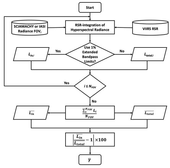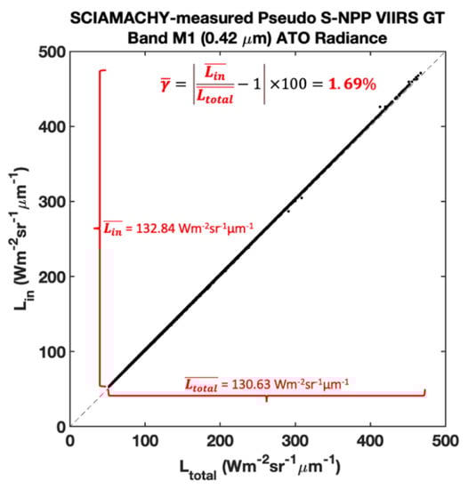 The solar reflective bands include I-bands I1–I3, M-bands M1–M10, and Day/Night Band (DNB) mid (MGS) and high (HGS) gain stages (where applicable). Band M11, with a central wavelength near 2.25 µm, is not evaluated due to poor SCIAMACHY spectral calibration quality []. Note that the S-NPP VIIRS DNB contribution is not investigated in this study owing to the absence of associated measured 1% extended bandpass limits [,]. A flowchart of the complete determination methodology is given in Figure 2. Alternatively, Figure 3 is a notated scatter plot of pseudo radiance Li/Ltotal pairs that illustrates determination for an all-sky tropical ocean (ATO) scene. and are the y-axis and x-axis averaged datapoints, respectively, the ratio of which is equal to the slope of a linear regression that is forced through the origin. The linear nature of the scatter datapoints is expected for comparable Earth-scene spectra given the rather subtle difference between in-band and full-band RSR structure, which is found to be true for all scenes investigated in this study. That is, the small difference in signal contribution between in-band and full-band RSR integration, which this study aims to quantify, can be expressed as a constant value for the given scene type, with small uncertainty.