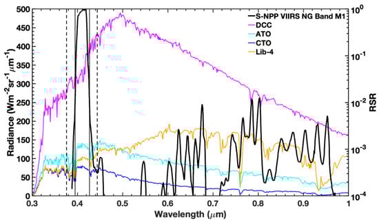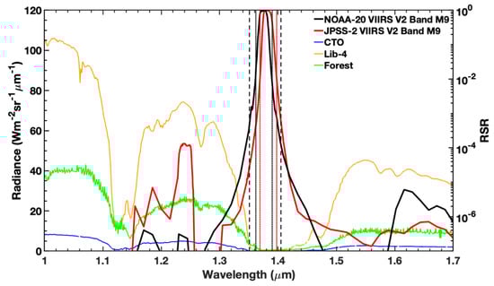 The cause of the scene-dependent variation in can be interpreted from visualization of the selected RSR, with its associated lower and upper 1% extended bandpass boundaries, overlaid with hyperspectral radiance spectra of the various Earth scenes. Such visualizations have been prepared as Figure 4, Figure 5 and Figure 6. For example, Figure 4 highlights the significant OOB signal of the S-NPP VIIRS M1 (~0.42 μm) band, in this case based on the NG RSR characterization effort, and how that might respond to the Earth-reflected spectra of common inter-calibration targets like DCC, ATO, CTO, and the Lib-4 PICS. Figure 5 reveals scene-dependent behavior for the S-NPP VIIRS NG M5 (~0.67 μm) band, which is an important spectral channel for inter-calibration and parameterization efforts [,,]. As seen in Table 7, Table 8, Table 9 and Table 10, only the M9 (~1.38 μm) bands offer values in exceedance of 0.5% for both NOAA-20 and JPSS-2, the nature of which can be evaluated in Figure 6 for select scenes.