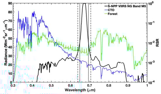 Although the I1 band appears to be relatively unimpacted by scene-dependent OOB contribution, the S-NPP VIIRS M5 band does exhibit rather large for ocean and vegetative scene types. In Figure 5, the S-NPP VIIRS NG M5 band is examined particularly with CTO (~0.5%) and Forest (~2%) given that CTO is a subset of ATO, which is relied upon in CERES inter-calibration, and Forest has the largest value of all M5 band scene assessments. Even though the OOB response for M5 does not reach the magnitude of that for M1, the response coupled with relatively high CTO radiance values near ~0.42–0.50 μm results in 0.5% OOB contribution, even considering counter-acting OOB contribution from measurements at wavelengths greater than the upper 1% extended bandpass limit. In the case of Forest spectra, the M5 in-band contributions are situated within in a relative minimum, i.e., a spectral “valley,” compared to immediate lower and higher wavelength ranges. As such, OOB integrated radiance contribution is compounded by strong signals on either side of the central wavelength with comparable response on the order of about 0.001. How this average OOB contribution might influence environmental retrievals can be examined through normalized difference vegetation index (NDVI) determinations, which are calculated from visible (VIS: ~0.65 μm) and near infrared (NIR: ~0.86 μm) radiance measurement ratios [NDVI = (NIR − VIS)/(NIR + VIS)] [,,,]. When considering measured 1% extended bandpass limits (Table 6), the S-NPP VIIRS NG bands M5 and M7 (~0.86 μm) 1.97% and 0.15%, respectively, OOB contributions would amount to less than a 1% change in NDVI for a rough median value of measured Forest radiance (i.e., ~24 Wm−2sr−1μm−1 for VIS and ~55 Wm−2sr−1μm−1 for NIR). The influence is small, but if relying on S-NPP VIIRS for NDVI determination, bands I1 and I2 (~0.86 μm) should be favored over the comparable M-bands when considering OOB-contributed error, because any reduction in contrast between the VIS and NIR bands owing to the OOB signal is undesirable. Although these OOB effects may only rarely require consideration within specialized, environmental retrieval subsets of the remote sensing community, there is, nonetheless, value to be found in improved understanding of scene-specific OOB contribution to the total signal, especially with regard to pre-launch evaluation.