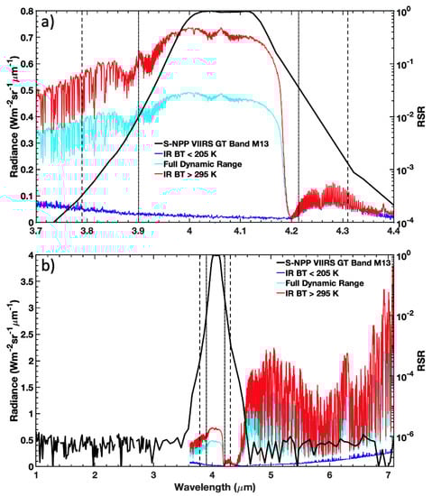 For VIIRS IR bands, with each instrument except for that on JPSS-2, a significant OOB influence of at least 0.5% is found only for band M13, especially for cold scenes, i.e., ~11-μm IR BT IASI footprint values smaller than 205 K (Table 11). The cause once again is due to a low in-band radiance signal (especially for cold measurements) being dominated by OOB leaks at high relative energy, which can be interpreted from Figure 7a following previously described analysis methods. In short, a significant portion of the OOB contribution is sourced from the energy in the wavelength range between the M13 specified and measured 1% extended bandpass limits, as evidenced by the at least 0.55% difference in for all three BT ranges, with all for the specified column being 0.09% or less (Table 11). The energy contribution from outside of this in-band-focused view of S-NPP VIIRS GT band M13 is insignificant. Nevertheless, a broader view of the complete OOB signal is given in Figure 7b, with x-axis limits based on the published OOB measurement range of 1000–7096 nm []. The RSR axis (right y-axis) lower limit has been extended from 10−4 to 10−7 in order to fit the band M13 response. The amount of sourced from this level of response, even for the relatively broad wavelength range covered and considering the higher values of integrated radiance compared to those of the in-band region, is small relative to the impact of OOB contribution from the higher response regions nearer to the extended bandpass limits, as discussed above. Specifically, based on integration starting at 4.4 μm (a relative radiance minimum) and ending at the upper OOB measurement range amounts to less than 0.006% for all three BT ranges.