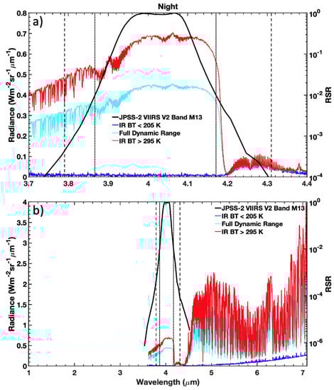 The fact that M13 is a mid-wave IR band suggests there could be a diurnal dependency owed to a daytime solar contribution. This idea is explored in Table 12 for all mid-wave IR bands, in which significantly greater values are found for nighttime measurements due to the overall decrease in energy at night, again with most significance for the coldest measurements. Daytime values are expectedly smaller in magnitude than those for the combined day and night analysis of Table 11, and although no additional bands, regardless of temperature, exceed the chosen 0.5% significance level at night, neither do previously significant bands drop below the 0.5% level during the day. Figure 8a not only reveals a significantly smaller in-band radiance for IR BT < 205 K, which is the cause of the 5.71% level for S-NPP VIIRS GT at night, but also offers evidence as to why these effects are not observed for JPSS-2 VIIRS V2. For S-NPP VIIRS GT, the measured upper 1% extended bandpass limit is at 4.2137 μm, which is near where the radiance signal begins to increase and the RSR is relatively strong. For JPSS-2 VIIRS V2, the measured upper 1% extended bandpass limit is at 4.171 μm, which is short of the signal increase that begins near 4.2 μm. Furthermore, the JPSS-2 VIIRS V2 RSR in this (>4.2 μm) OOB region is steeper and of lesser magnitude compared to those for S-NPP VIIRS GT. Figure 8b is given with the same axes limits as those of Figure 7b in order to highlight the OOB signal differences between the S-NPP VIIRS GT and JPSS-2 VIIRS V2 band M13, the latter case being significantly more constrained. For the remaining IR bands where radiance magnitudes are higher overall, OOB contribution to the total signal is minimal.