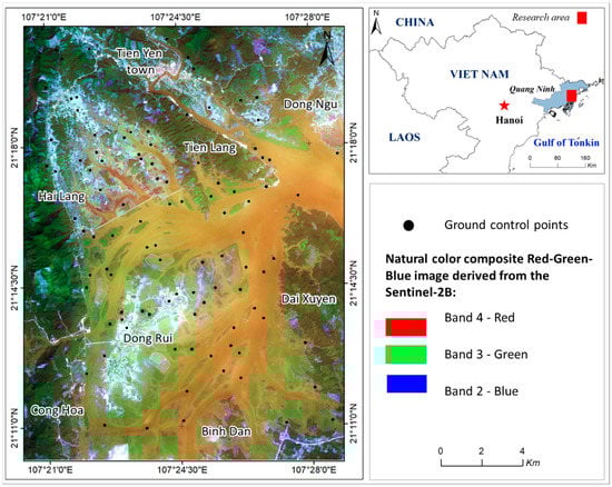 Study area on Sentinel-2 image obtained in 22 November 2019 and the location of ground control points (GCPs) in Tien Yen district, Quang Ninh province, Vietnam.