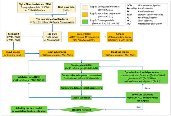 The development of the deep learning models is developed through three main steps, including (1) zoning wetland areas; (2) input data preparation; and (3) training models. The structure of the deep learning model development for coastal wetland classification is shown in Figure 2. These contents will be explained in Section 2.3, Section 2.4 and Section 2.5. Firstly, Section 2.3 presents the methods to collect and set up training and validation data.