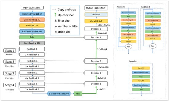 Each layer of the ResU-Net transforms original data into new states based on chosen features. Five consequential types of layers were applied to build the encoder architecture include (1) INPUT Layer, (2) Batch Normalization Layer, (3) Padding layers, (4) Convolutional Layer (CONV), and (5) Pooling Layer (POOL). These five-layer types were arranged, as shown in Figure 4, to form a full ResU-Net architecture and described as follows: