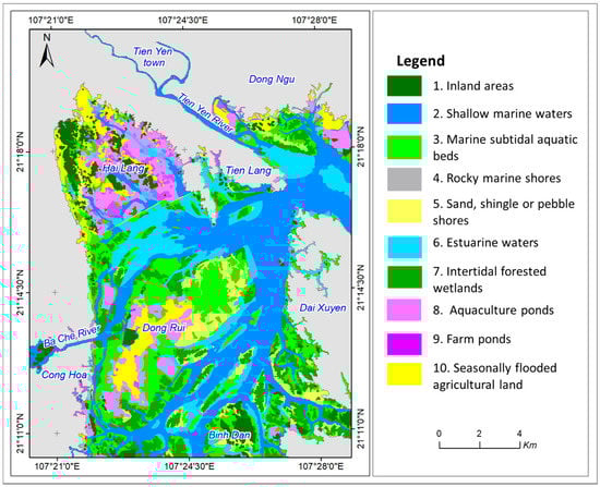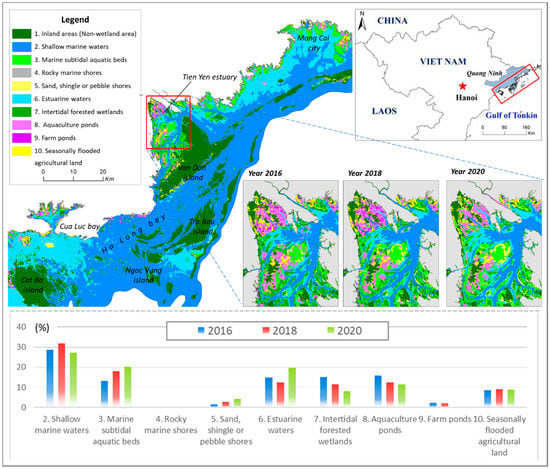 In Vietnam, the wetland is diverse, covering approximately 5,810,000 ha, accounting for about 8% of Asia’s entire wetland areas [9,10]. Both direct and indirect values of this ecosystem in the northeastern part of Vietnam were estimated at about USD 2063–2263 per hectare per year [11]. Currently, the wetland ecosystem along the coasts is facing threats from the population growth (about 1.32%/year), the high population density (about 276 people/km2), and the rapid urbanization (about 33% since 2010) [12]. For example, in Hai Lang commune in the northeastern part, about 1,000 hectares out of 6000 hectares of mangroves have been completely degraded over the past 15 years [13], making it one of the 12 most seriously degraded ecosystems in Vietnam due to the process of urbanization and conversion to agricultural land [14]. Although the degradation and the conversion of wetlands have been warned during the last 10 years, the assessment, inventory, and monitoring of these changes are still facing difficulties due to the lack of accessibility and technology. Therefore, it is essential to equip managers with better tools to classify and monitor wetland ecosystems at least twice a year.