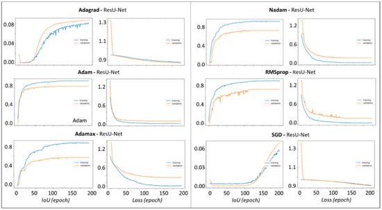 Fluctuation of IOU and loss function values after 200 epochs of ResU-Net models using six optimizer functions.