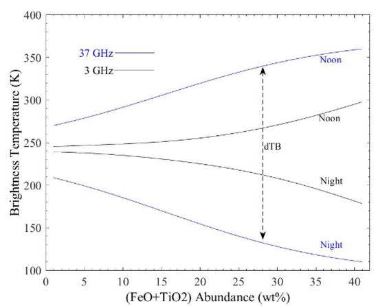 - Meng, Z.; Yang, G.; Ping, J.; Cai, Z.; Gusev, A.; Osei, E.M. Influence of (FeO+TiO2) abundance on the microwave thermal emissions of lunar regolith. Sci. China Earth Sci. 2016, 59, 1498–1507. [Google Scholar] [CrossRef]
