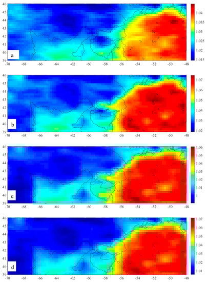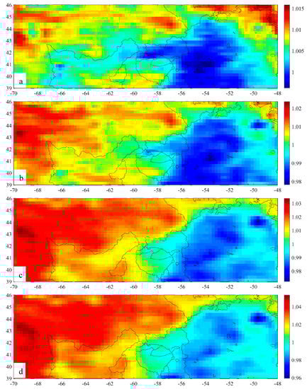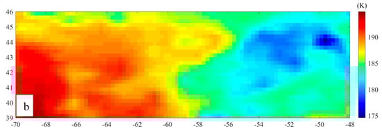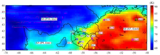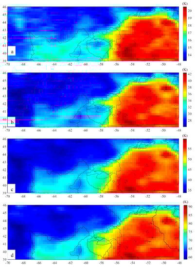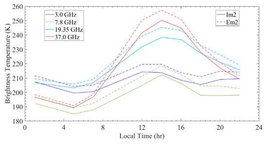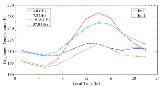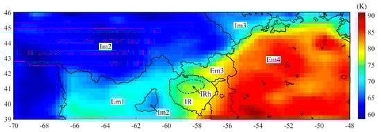 - At noon, the 3.0 GHz nTB in the central and northwestern parts is lower than the remaining area, while they become homogeneously high in the other three channels. At night, the nTB in the western part is lower than that in the eastern part. In addition, the dTB of Em4 in the western and southern parts is homogeneously high (Figure 6).