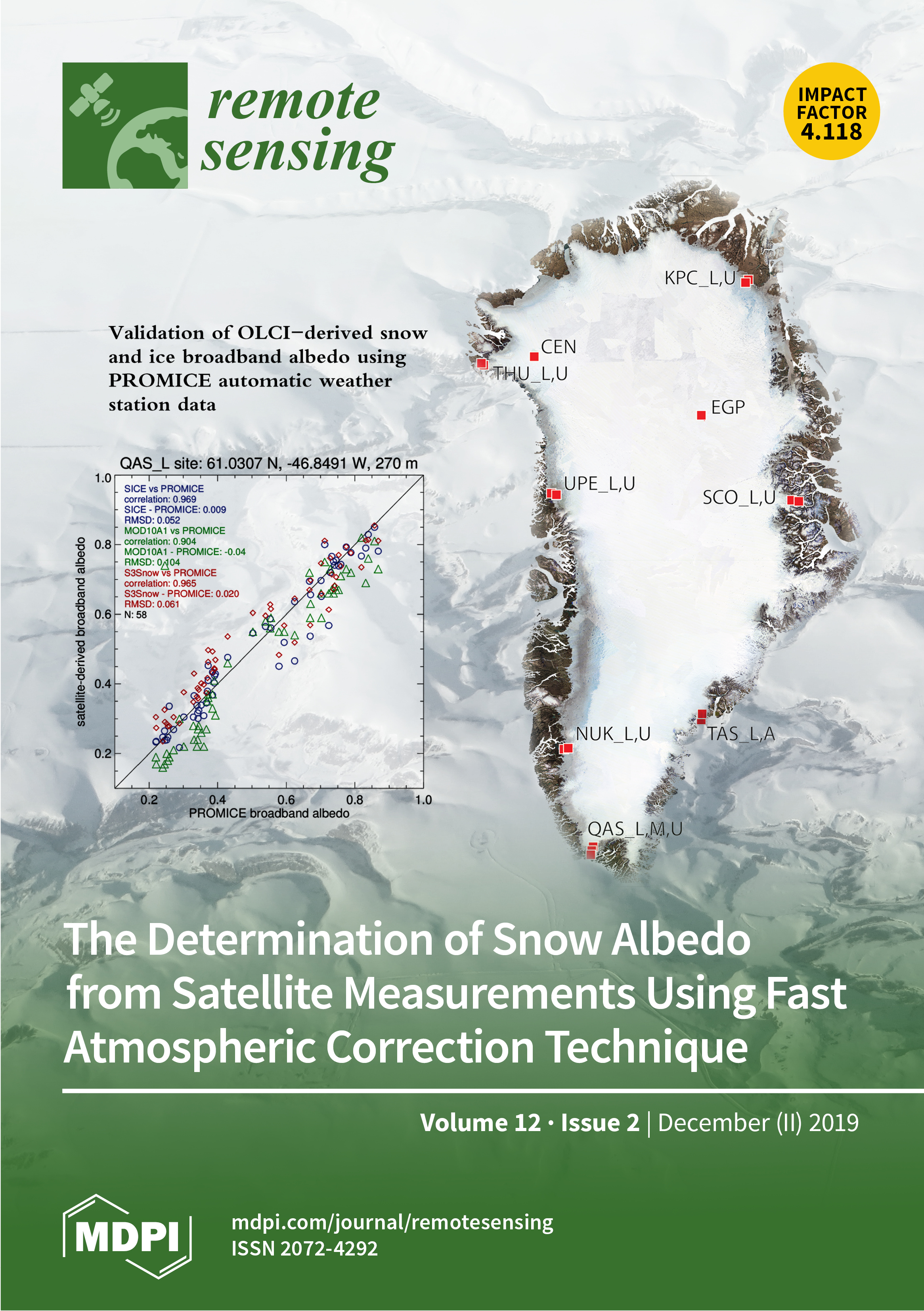 Cover Story: We present a simplified atmospheric correction algorithm for snow/ice albedo retrievals using single view satellite measurements. The validation of the technique is performed using Ocean and Land Colour Instrument (OLCI) on board Copernicus Sentinel-3 satellite and ground spectral or broadband albedo measurements from locations on the Greenland ice sheet and in the French Alps. Through comparison with independent ground observations, the technique is shown to perform accurately in a range of conditions from a 2100 m elevation mid-latitude location in the French Alps to a network of 15 locations across a 2390 m elevation range in seven regions across the Greenland ice sheet. Retrieved broadband albedo is accurate within 5% over a wide (0.5) broadband albedo range of the (N = 4155) Greenland observations and with no apparent bias.View this paper.