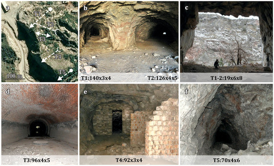 (a) Position of the tunnels (T) inside the old concrete factory. The ends of each tunnel are marked to denote whether they are open (arrowhead), partially obstructed (semicircle), or completely obstructed (full circle). (b,d–f) Each tunnel and their dimensions in metres (length, height, width). (c) Section of the tunnels that connects T1 and T2, and their dimensions.