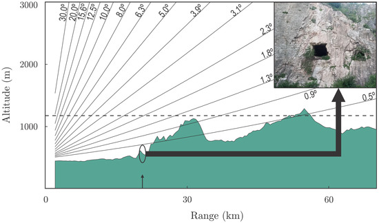 Description of the elevation profile of the land in the direction of the shelter, this last marked with an arrow and an oval. The elevation angles of the radar are described in solid black lines and a photograph of the outside of the common portion between tunnels 1 and 2 is shown. The horizontal black dashed line shows the height at which the observation is made (see intersection with plan position indicators (PPI) 4 (line 1.8 degrees).