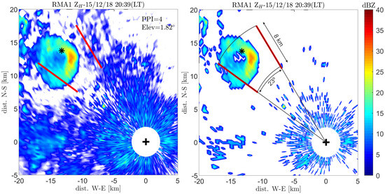 A weather radar is an instrument used to detect and characterize storms and other meteorological phenomena. The radar antenna emits pulses of radiation to targets under observation which intercept and scatter part of the pulse energy. This received signal or echo is amplified, digitized, and processed in the radar receiver, so it can be displayed and recorded. The time elapsed between the emission and the back-scattered signal reception is used to determine the target range since the pulses move at the speed of light [39]. The RMA1 is a C-band polarimetric Doppler radar located at the campus of the National University of Córdoba, Argentina (31.441S, 64.191W). The radar emits both horizontal (H) and Vertical (V) polarizations simultaneously, allowing the calculation of 3D fields of several variables or parameters: horizontal () and vertical reflectivity () factors in dBZ (decibels of Z), radial velocity (), spectral width (W), differential reflectivity (), differential phase (), specific differential phase (), and correlation coefficient (). The coverage radius of successive volumes is 240 km [29].
