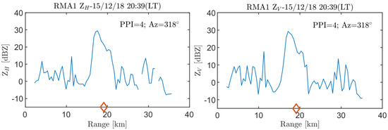 Reflectivity factor for both the horizontal (Z) and vertical (Z) channels as a function of distance to radar (range) for azimuth of 318°. The red rhombus marks shelter position.