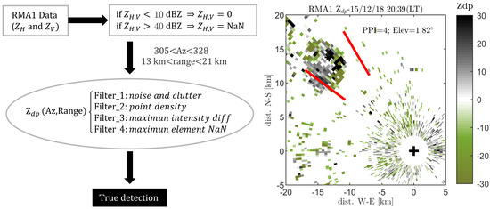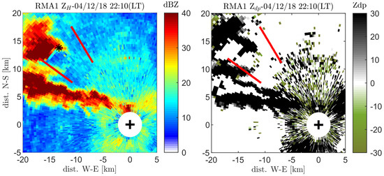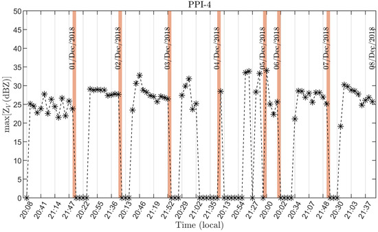 The analysis performed on 15 December 2018, shows that the maximum reflectivity factor is close to 30 dBZ for both the vertical and horizontal channels, as can be seen in Figure 4. This figure also exposes the level of noise floor that may contain the information associated with detection. This criterion determines the first stage of the detection algorithm and is based on filtering the Z and Z data (if Z 40 dBZ, Z = NaN and if Z 10 dBZ, Z = 0).