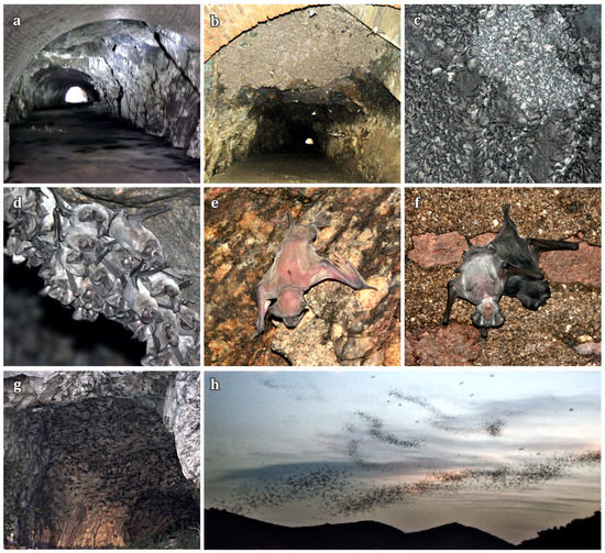 Colony of Tadarida brasiliensis. (a) Aspect of the shelter after migration (13 May 2014) and (b) after the return (30 November 2017), (c) bats crowded, the pale colored sector belongs to a group of newborn pups (30 November 2017), (d) group of adults (9 December 2014), (e) a newborn (30 November 2017), (f) two juveniles with different degree of hair coverage (January 27, 2014), (g) the emergence of the colony from the common portion of tunnel 1 and 2 (7 December 2018), (h) mass emergence as a continuous serpentine stream (21 January 2012). (Photo credits: S. Villalba—a, d, and g; L. Boero—b, c, e, and f; V. Damino—h).